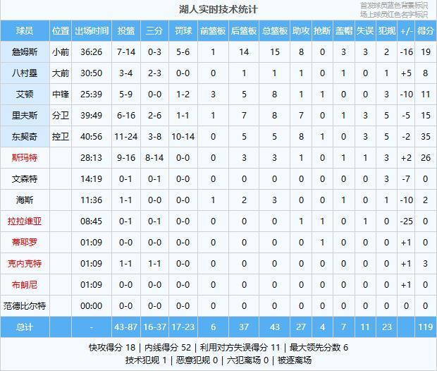 湖人(主队):东契奇35分5板8助、斯玛特26分3板1助、詹姆斯19分15板8助3帽、里夫斯15分8板7助、艾顿11分8板1助、八村塁8分1板1助、克内克特3分、海斯2分3板、拉拉维亚1助